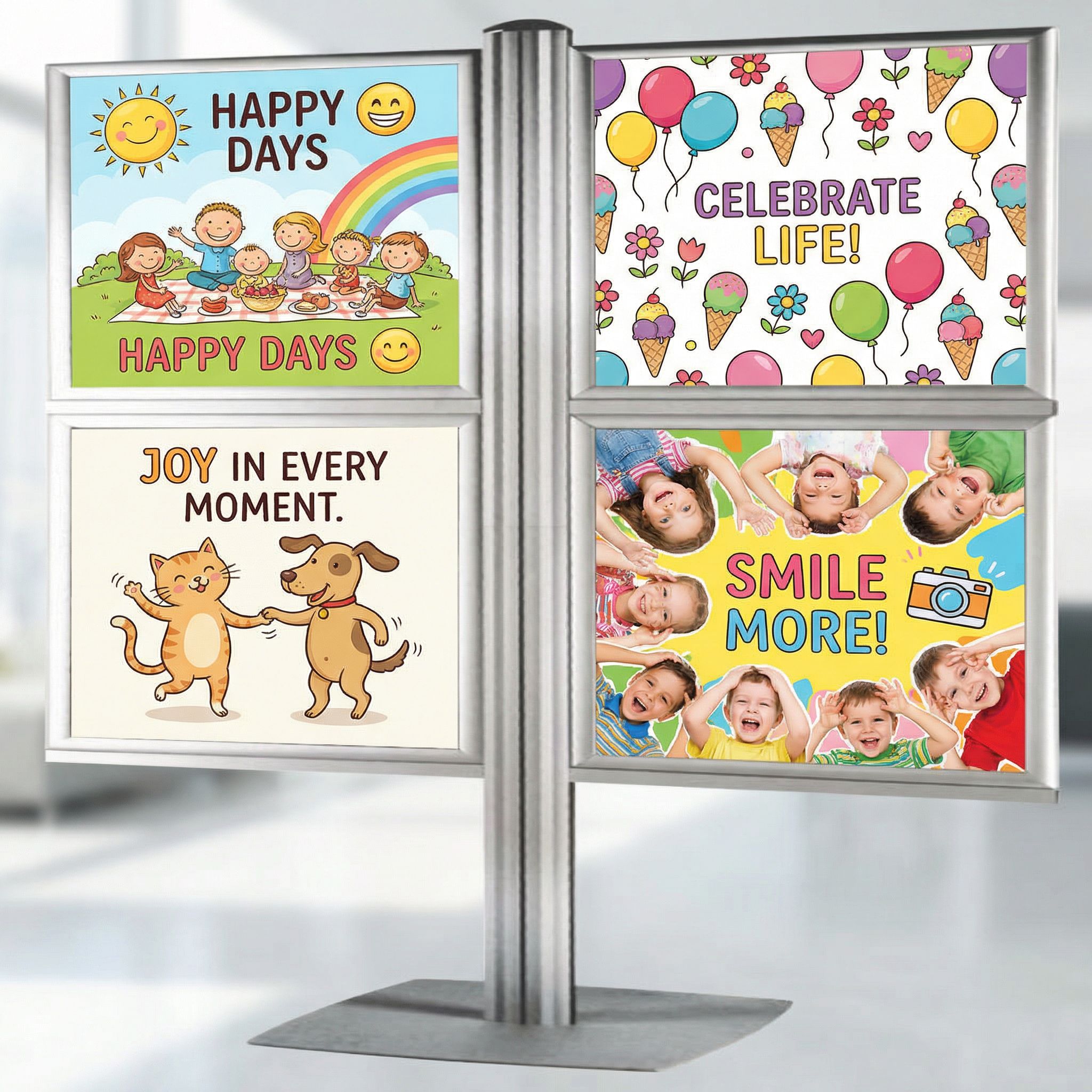 Ευέλικτο σύστημα προβολής. Moνής ή διπλής όψης. Με δυνατότητα διαφορετικών συνδυασμών. 4 Slide-in αφισοθήκες 50*70 με κορνίζα.